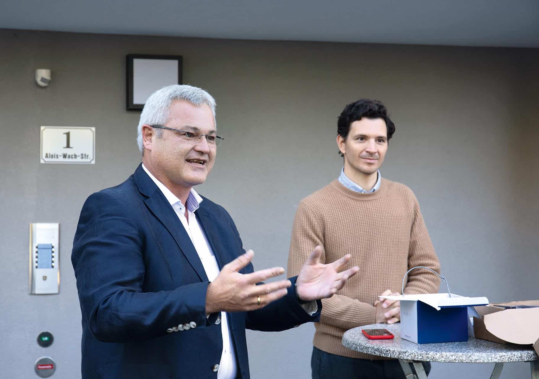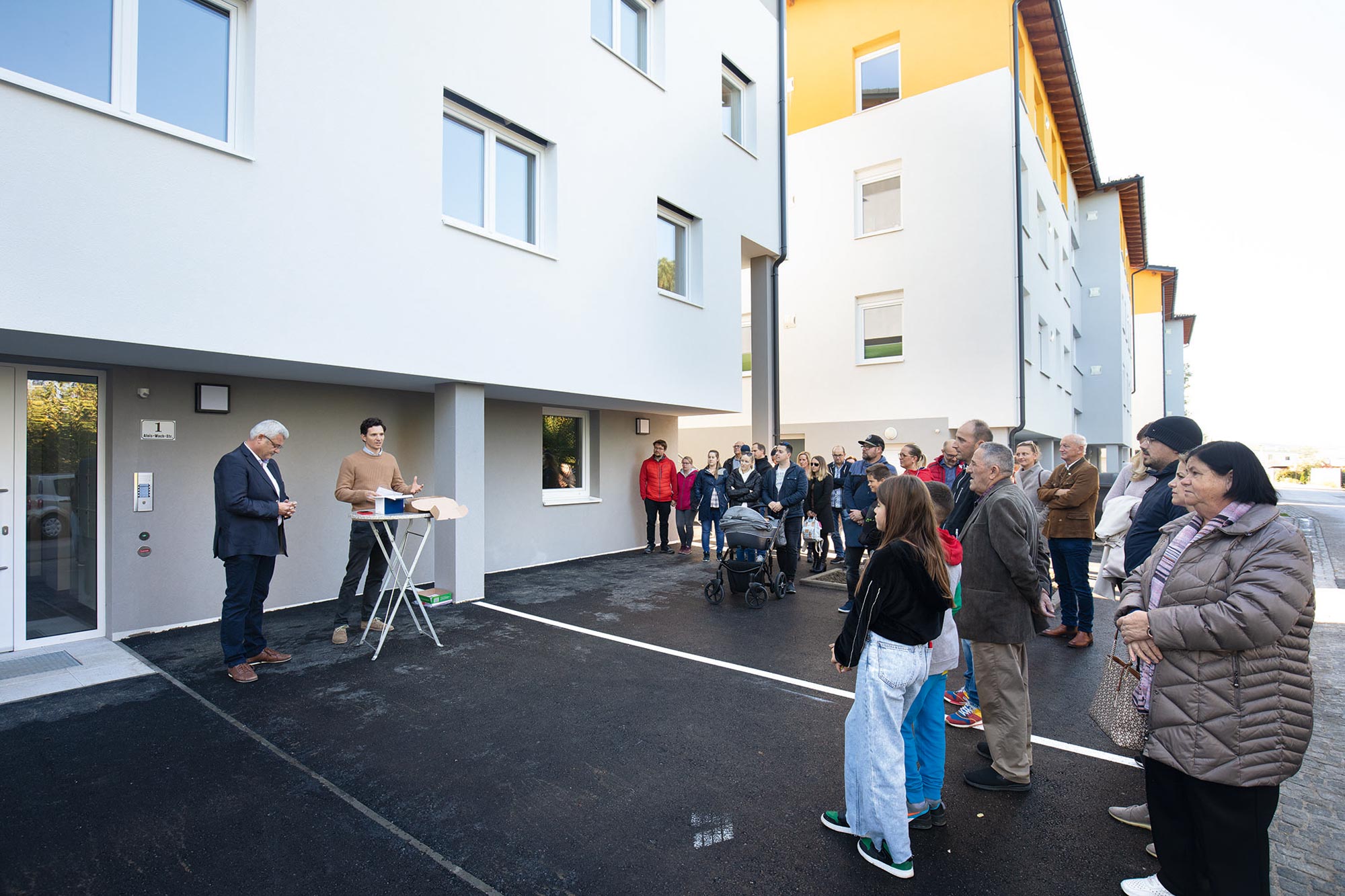 Ing. Johannes Moser, gewählter Bürgermeister von Lambach, übergibt gemeinsam mit DI Florian Öhlinger den fertiggestellten 3. Bauabschnitt der Wohnanlage Lambach (Bauleitung Günter Kaindl) mit 15 Wohnungen an die glücklichen Bewohner.